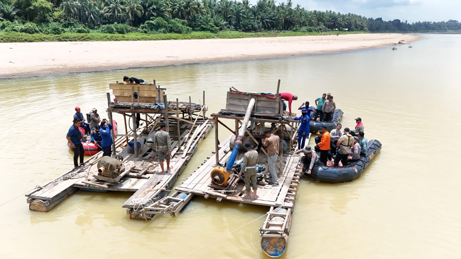 Dari hasil patroli, tim menemukan sedikitnya 55 unit rakit PETI, terdiri dari 35 unit di Desa Pulau Bayur dan 20 unit di Desa Teluk Pauh. Lima rakit PETI di Desa Sikakak dan Pulau Jambu langsung dilakukan penindakan dengan cara dirusak.