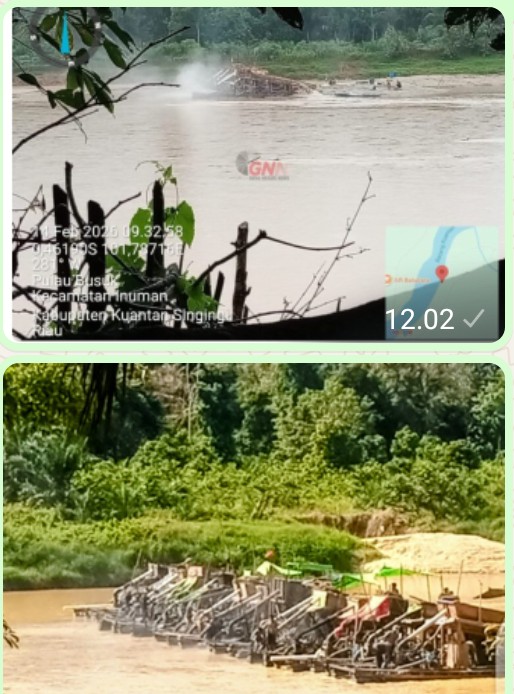 Pantauan pada Jumat (14/2/2026) sekitar pukul 09.32 WIB memperlihatkan sejumlah rakit penambangan berjejer di alur Sungai Kuantan. Mesin sedot tampak bekerja tanpa henti, mengeruk material dasar sungai, disertai semburan asap atau uap. Kondisi air sungai berubah keruh kecokelatan, menandakan intensitas pengerukan yang masif dan berpotensi merusak ekosistem perairan.